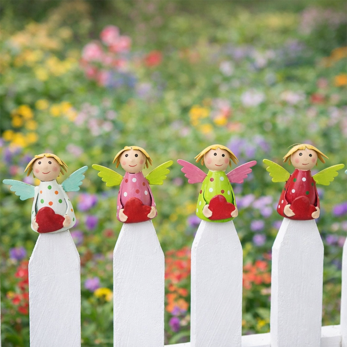 Produktinformationen "Zaunhocker Engel Schutzengel used look, Metallengel mit Herz und grünem Pünktchen-Kleid, 9cm"