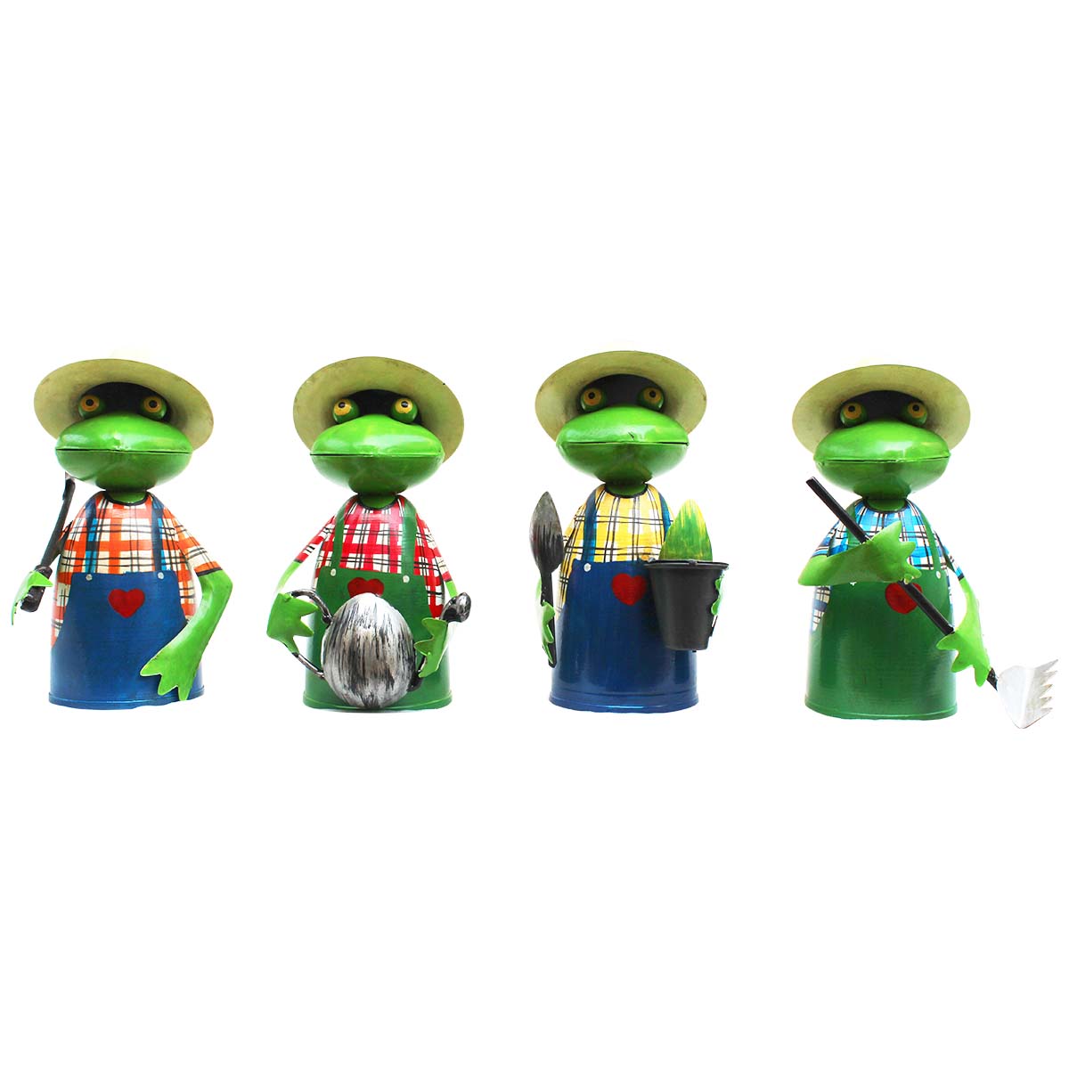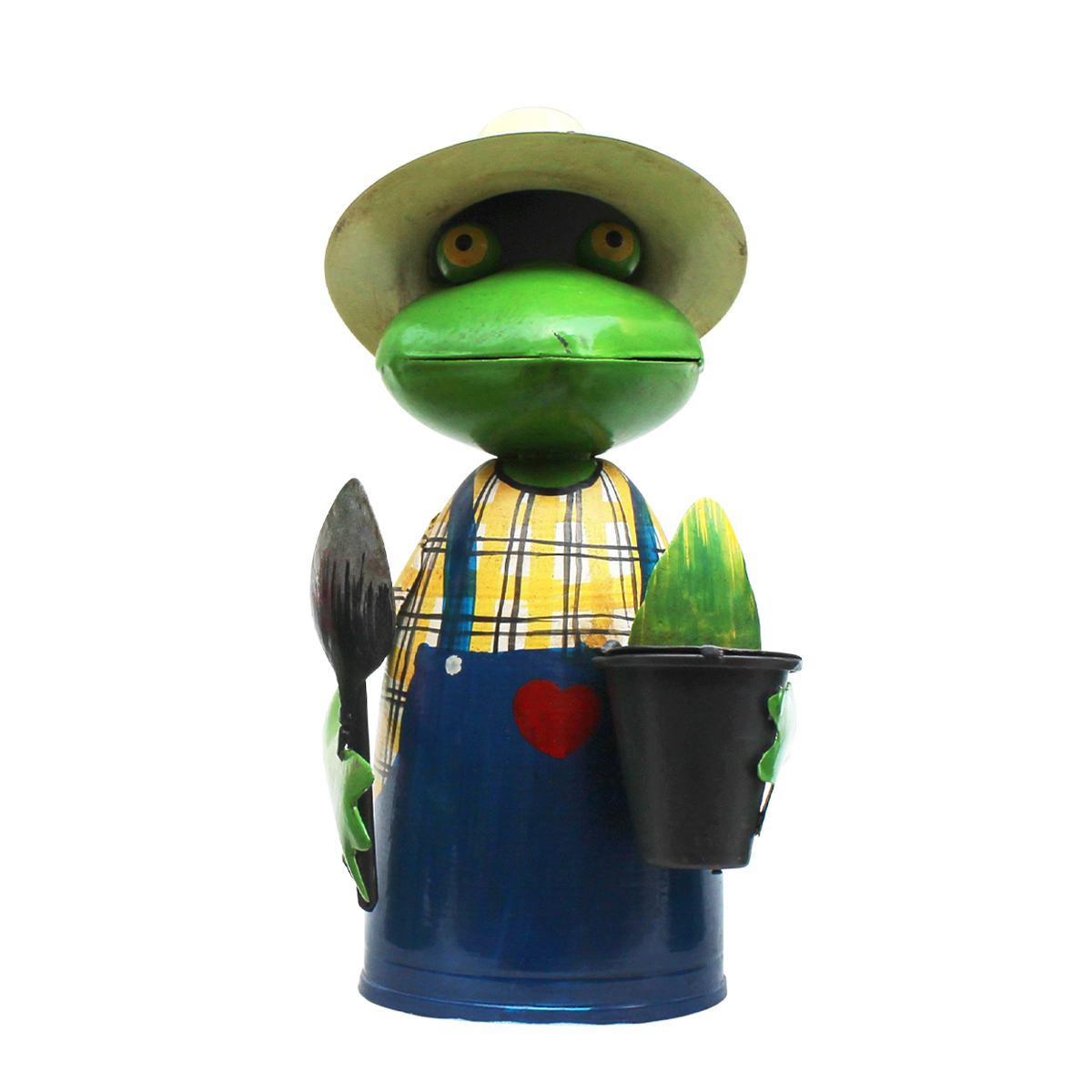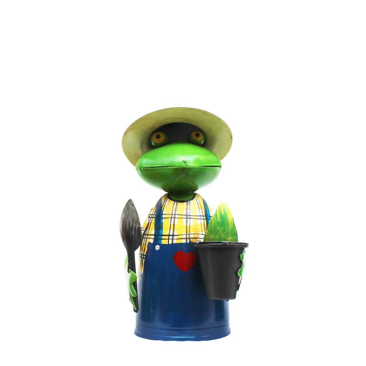 Zaunhocker Frosch Gärtner mit Pflanze und Schaufel, Metallfrosch in Gärtnerschürze und Sonnenhut, 21