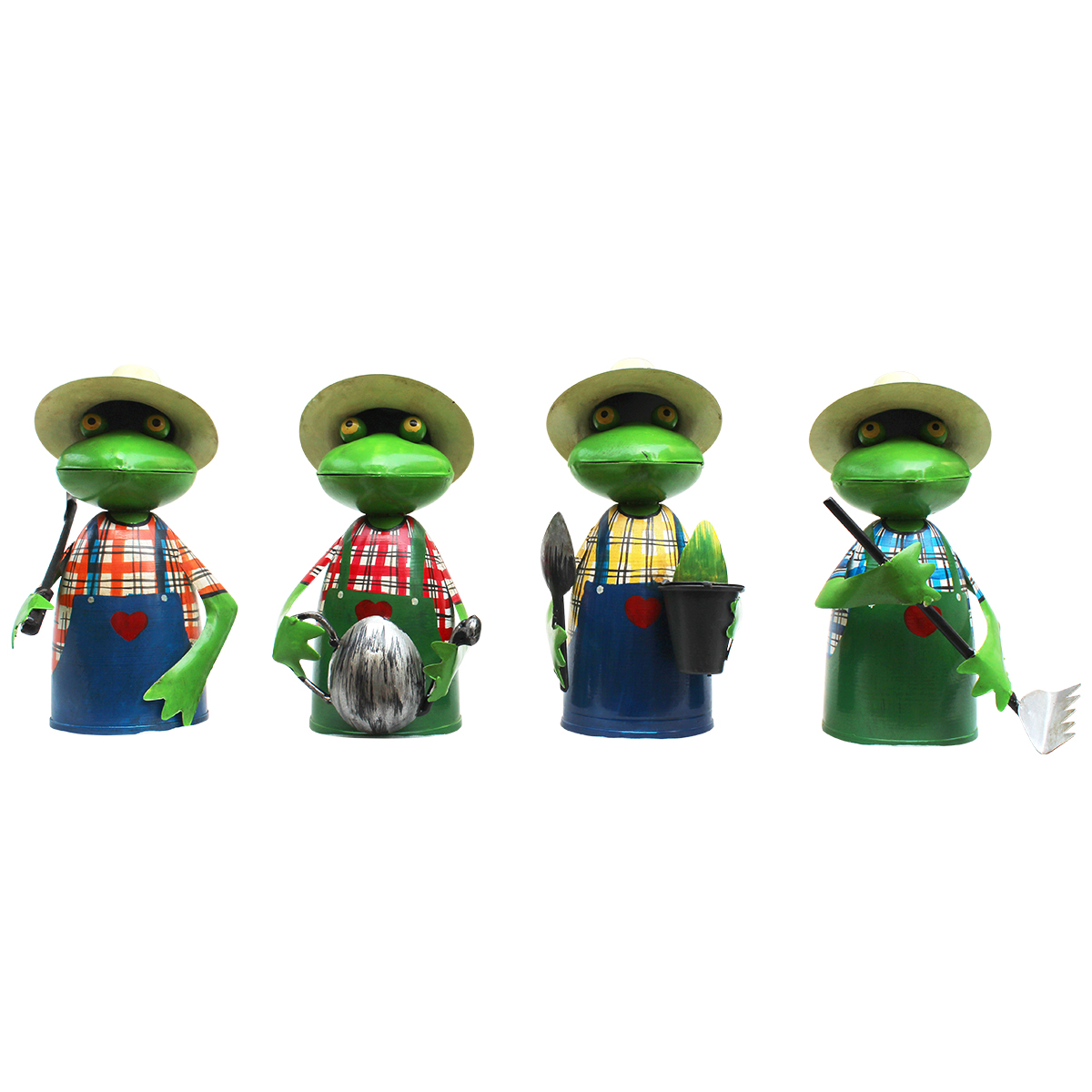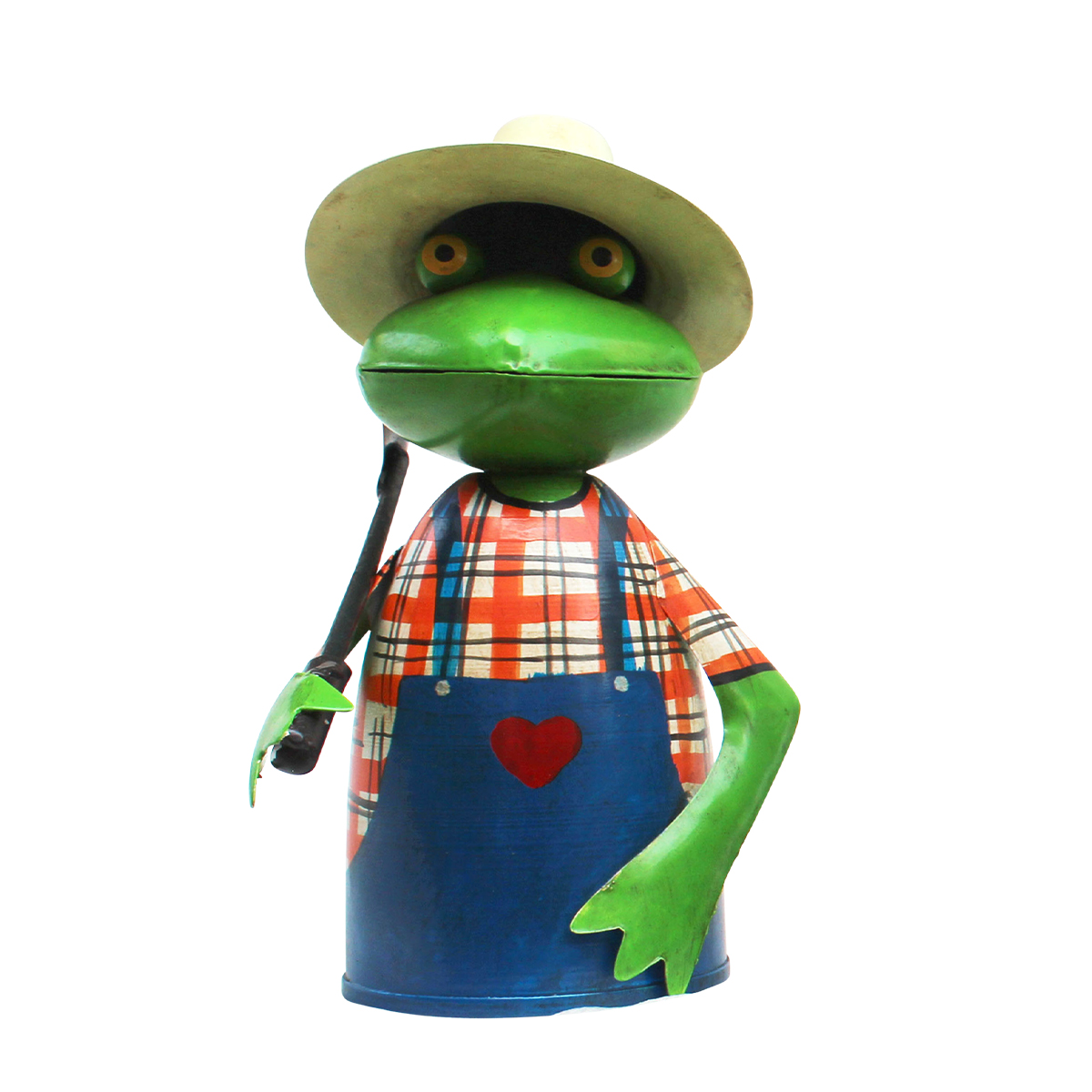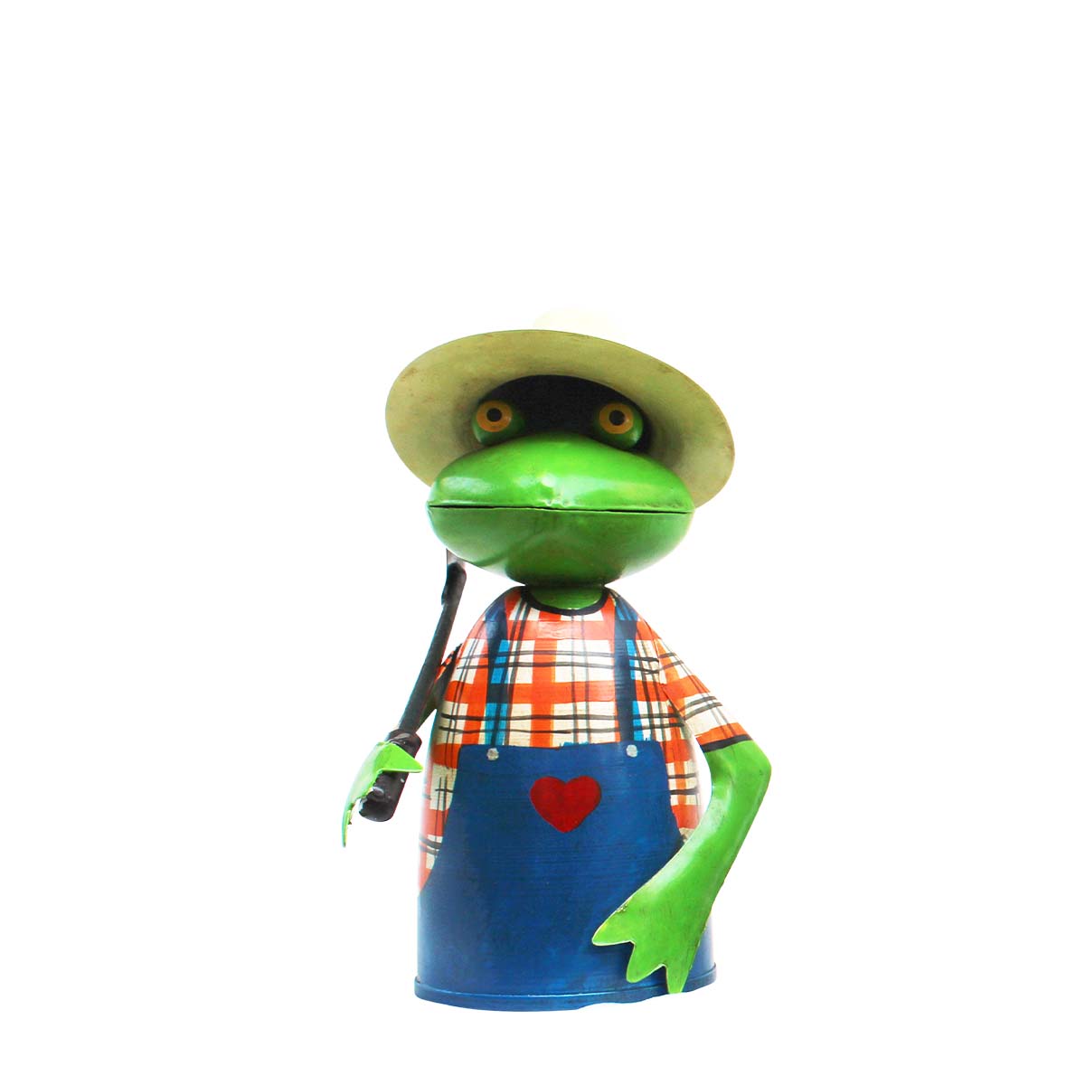 Zaunhocker Frosch Gärtner mit Stab, Metallfrosch in Gärtnerschürze und Sonnenhut, 21cm