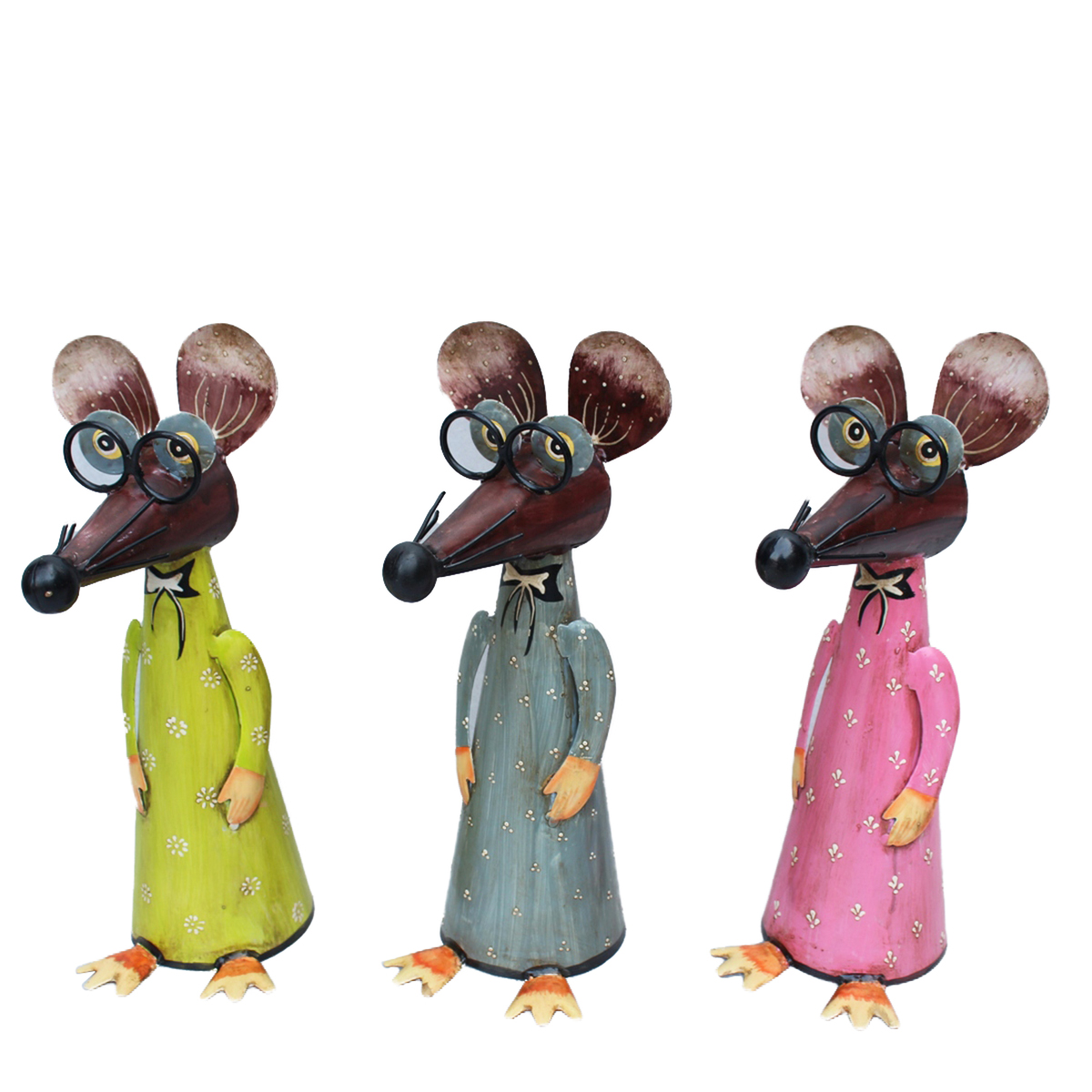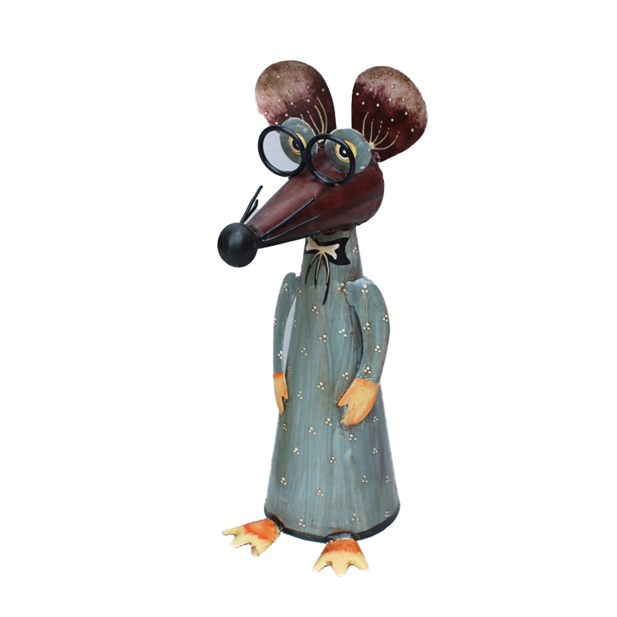 Zaunhocker Maus mit langer Nase und Brille, Metallmaus mit graublauem Kleid, 30cm
