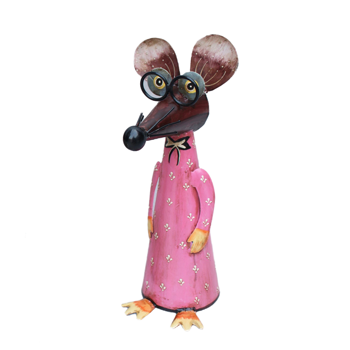 Zaunhocker Maus mit langer Nase und Brille, Metallmaus mit rosa Kleid, 30cm